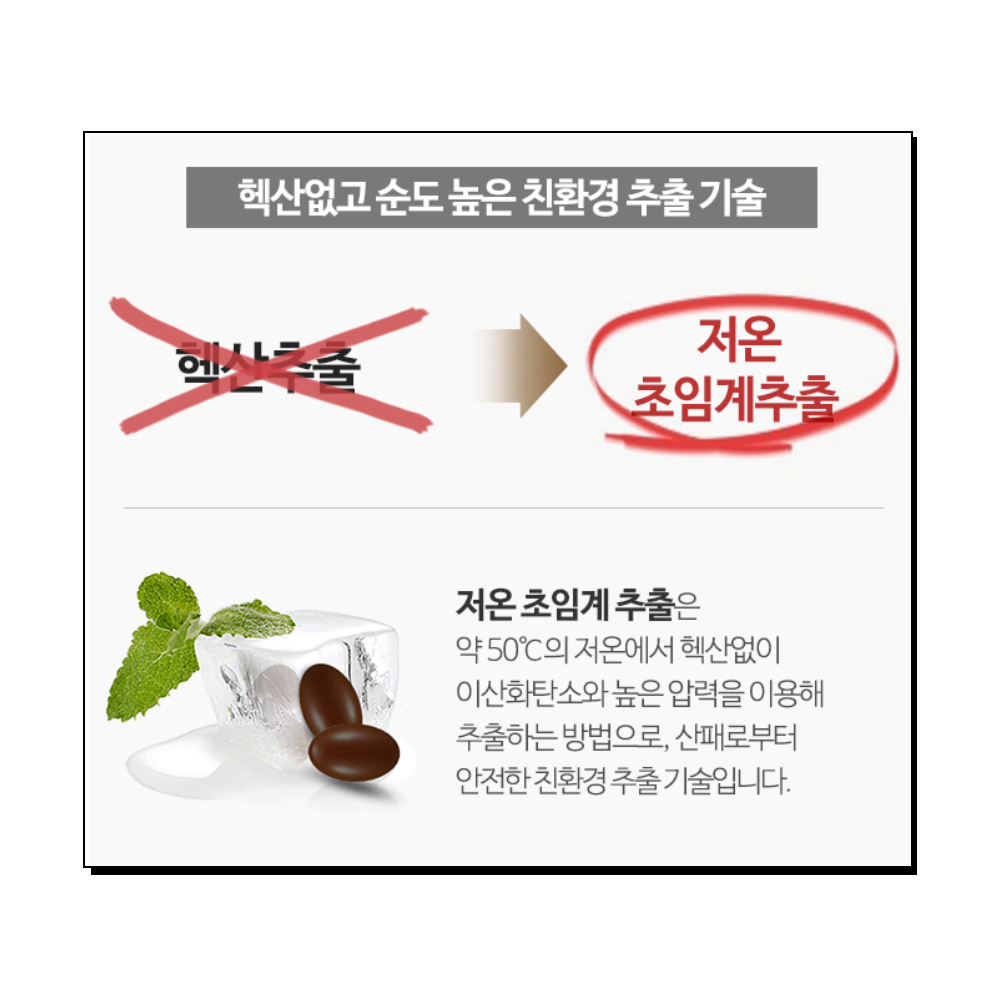 보통의 영양제를 뽑아내는 추출방식은 헥산과 같은 용매를 사용해서 원료로부터 영양성분을 추출하는데요. 헥산 추출방식은 저렴한 가격으로 많은 양을 생산할 수 있지만, 그 헥산이 잔여로 남아서 인체에 유해하다는 치명적인 단점이 있습니다.