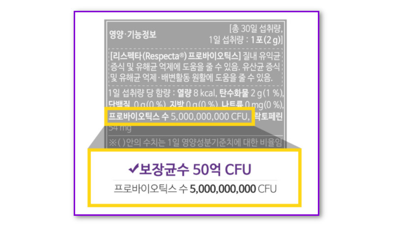 ‘투입균수’ 와 ‘보장균수’ 는 달라요. 보통 유산균 홍보 시 투입균수를 안내하는 경우가 많은데요,