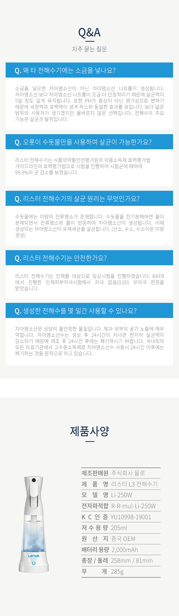 📌리스터 L3 살균수 성분 치아염소산수