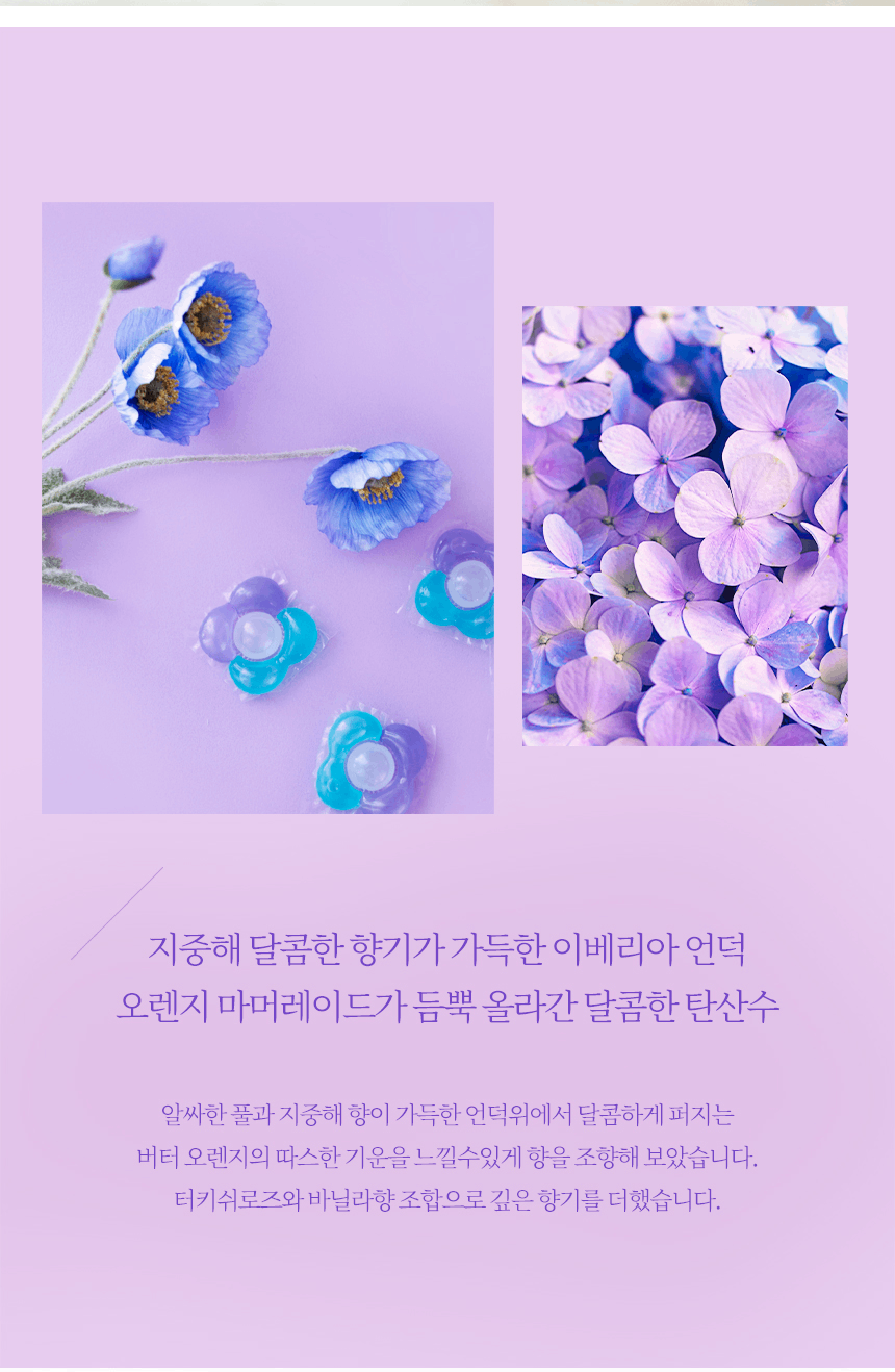 설탕머금은 오렌지와 바닐라향, 그리고 약간의 터키쉬 로즈향을 품은 캡슐세제에요!