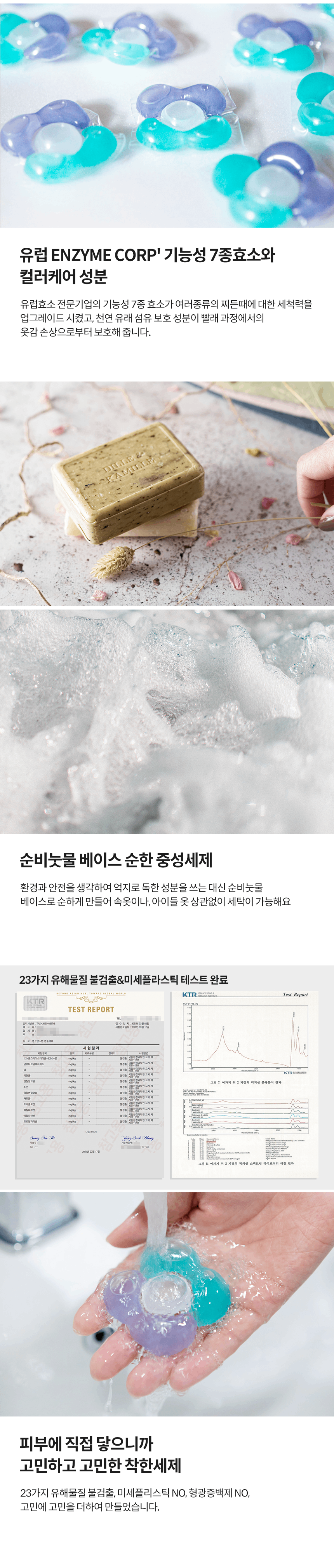 - 세계적인 효소 기업인 덴마크 에보자임사의 특화된 7종 효소를 넣어 특정 얼룩을 분리&분해하여 효과적으로 세탁