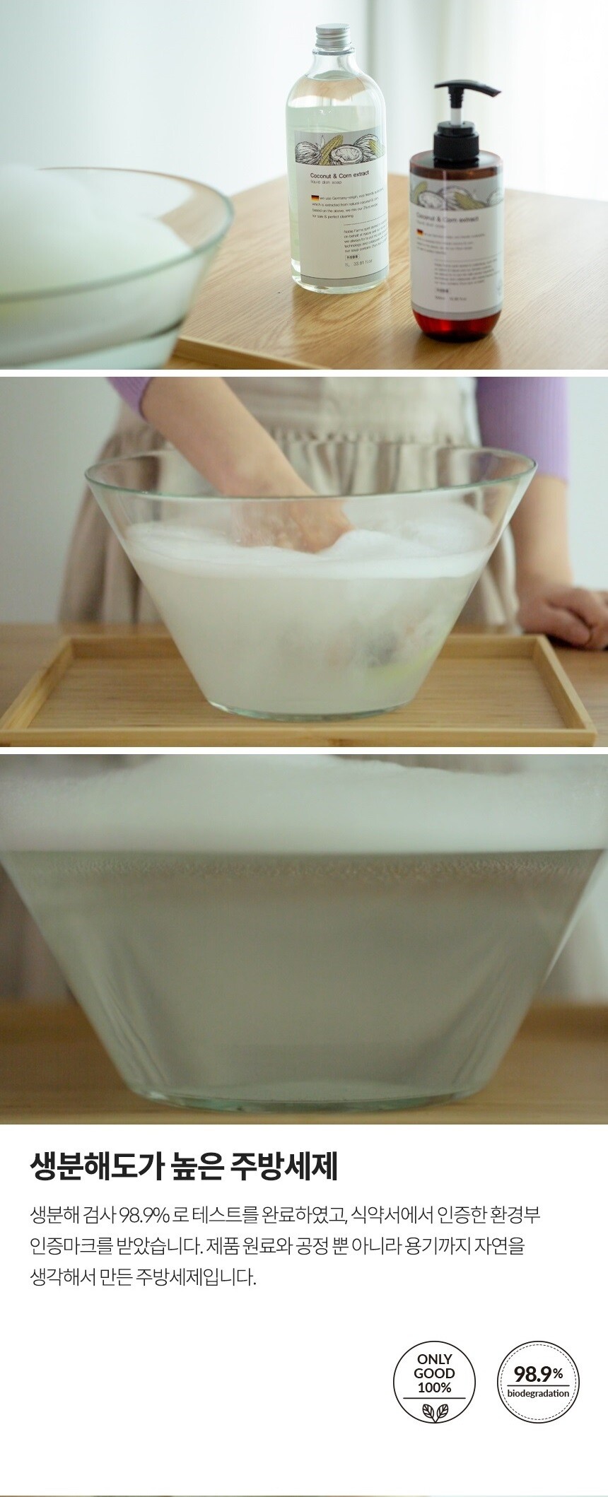 무려 98.9%의 높은 생분해도로 잔여세제 걱정을 하실 필요가 없습니다.