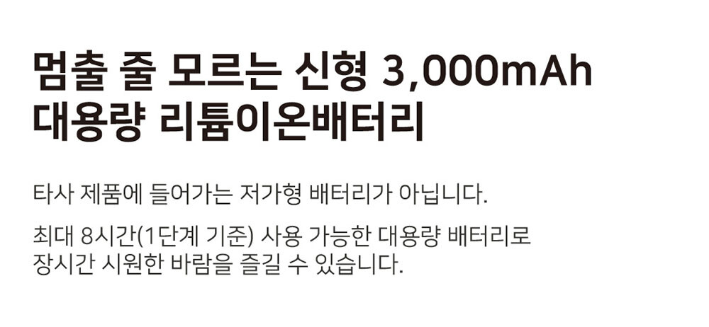 ▶신형 3000mAh 대용량 리튬 이온배터리로 최대 8시간 사용
