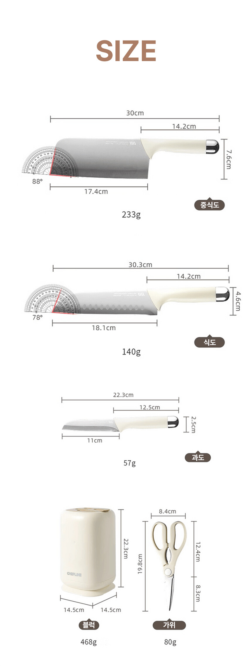 주방에 꼭 필요한 식도, 중식도, 과도 4종세트 구성과
