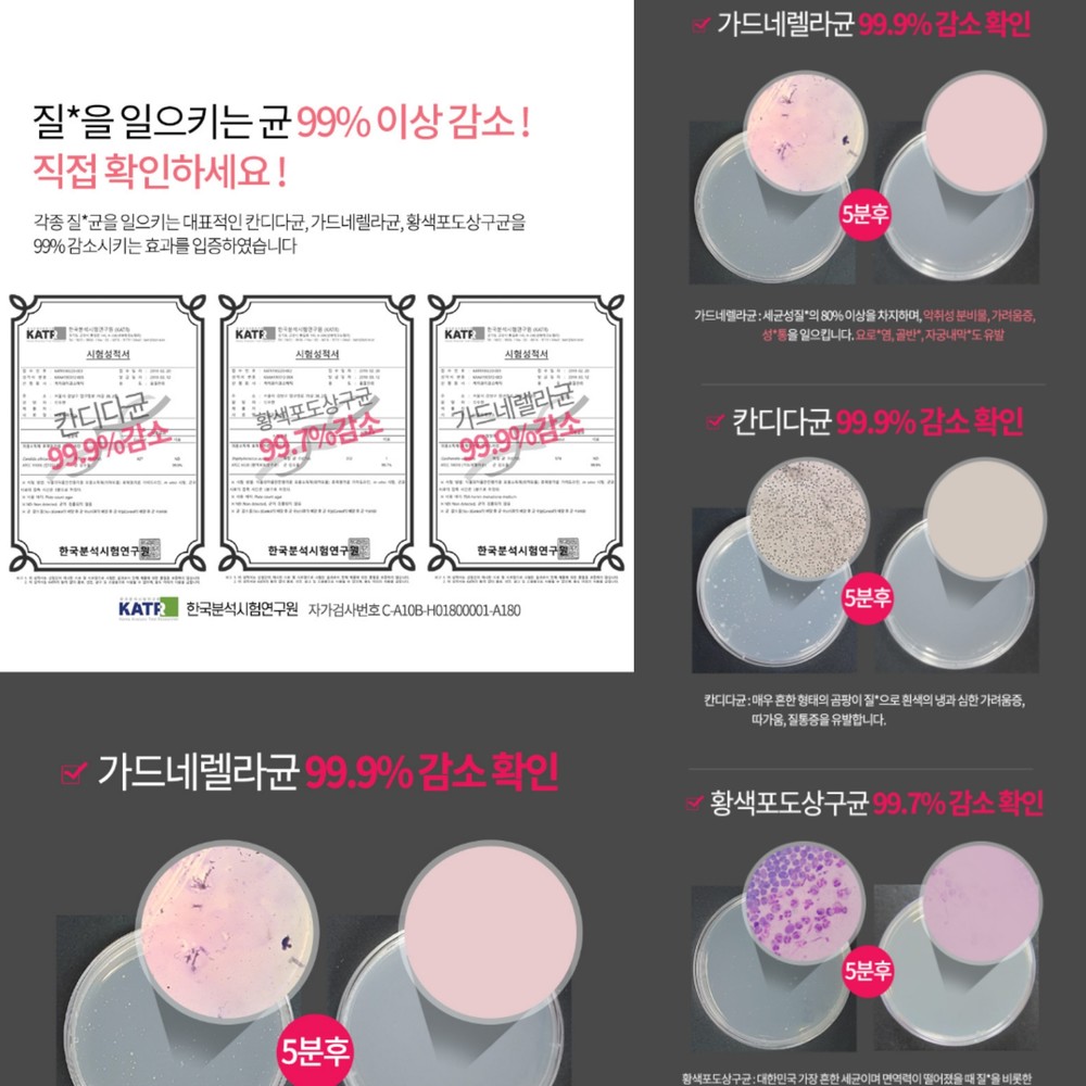 🏷질염을 가장 많이 유발하는 대표 3대균. 칸디다균(가려움증), 가드네렐락균, 황색포도상구균 3가지 99%이상 감소. (한국분석시험 연구원)